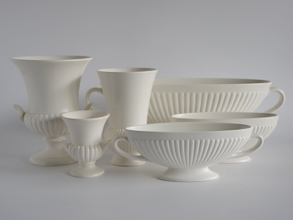 ウェッジウッドのムーンストーンと呼ばれるクリーム色です。つや消しの為、サラサラとした気持ちの良い手触りです。耳付きで全体のバランスが良く、何も入れずに飾るだけで素敵なベースです。中にオアシスを入れて花やグリーンを生けても綺麗だと思います。